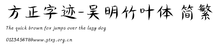 方正字迹-吴明竹叶体 简繁.ttf是由字体厂商(设计师)方正出品的一款字体.方正字库隶属于北京北大方正电子有限公司(简称方正电子)。方正电子是专业从事中文字库开发的厂商,现拥有各种中、西文以及多民族文种字库数百款。作为享誉全球的方正中文电子出版系统的重要组成部分,方正字库一向以字款丰富,品质精良,适用面广,能迅速满足客户需求而在专业出版、印刷领域中享有盛誉。方正电子一向以推动中文字库技术进步,促进中文印刷字体的发展为己任,每年推出的创新字体都在十款以上。同时,方正电子还积极参与中国国家标准和国际ISO组织相关标准的制订,如GBK、GB18030、ISO/IEC-10646等。方正字库字款丰富、字形美观、性能稳定、适应面广,运行速度快,且存贮容量小。全面支持GB、GBK、GB18030、BIG-5以及JIS、KSC等编码体系,可以提供TrueType,PostScript Type1、Type0、CID等各种通用格式字库。方正字库官网http://www.foundertype.com/index.php/FindFont/index.html?utm_source=zitixiazai