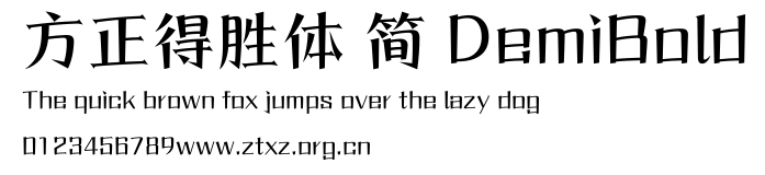 方正得胜体 简 DemiBold.ttf是由字体厂商(设计师)方正出品的一款字体.方正字库隶属于北京北大方正电子有限公司(简称方正电子)。方正电子是专业从事中文字库开发的厂商,现拥有各种中、西文以及多民族文种字库数百款。作为享誉全球的方正中文电子出版系统的重要组成部分,方正字库一向以字款丰富,品质精良,适用面广,能迅速满足客户需求而在专业出版、印刷领域中享有盛誉。方正电子一向以推动中文字库技术进步,促进中文印刷字体的发展为己任,每年推出的创新字体都在十款以上。同时,方正电子还积极参与中国国家标准和国际ISO组织相关标准的制订,如GBK、GB18030、ISO/IEC-10646等。方正字库字款丰富、字形美观、性能稳定、适应面广,运行速度快,且存贮容量小。全面支持GB、GBK、GB18030、BIG-5以及JIS、KSC等编码体系,可以提供TrueType,PostScript Type1、Type0、CID等各种通用格式字库。方正字库官网http://www.foundertype.com/index.php/FindFont/index.html?utm_source=zitixiazai