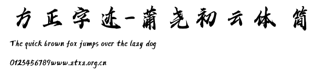 方正字迹-蒲尧初云体 简.ttf是由字体厂商(设计师)方正出品的一款字体.方正字库隶属于北京北大方正电子有限公司(简称方正电子)。方正电子是专业从事中文字库开发的厂商,现拥有各种中、西文以及多民族文种字库数百款。作为享誉全球的方正中文电子出版系统的重要组成部分,方正字库一向以字款丰富,品质精良,适用面广,能迅速满足客户需求而在专业出版、印刷领域中享有盛誉。方正电子一向以推动中文字库技术进步,促进中文印刷字体的发展为己任,每年推出的创新字体都在十款以上。同时,方正电子还积极参与中国国家标准和国际ISO组织相关标准的制订,如GBK、GB18030、ISO/IEC-10646等。方正字库字款丰富、字形美观、性能稳定、适应面广,运行速度快,且存贮容量小。全面支持GB、GBK、GB18030、BIG-5以及JIS、KSC等编码体系,可以提供TrueType,PostScript Type1、Type0、CID等各种通用格式字库。方正字库官网http://www.foundertype.com/index.php/FindFont/index.html?utm_source=zitixiazai