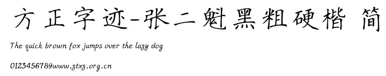 方正字迹-张二魁黑粗硬楷 简.ttf是由字体厂商(设计师)方正出品的一款字体.方正字库隶属于北京北大方正电子有限公司(简称方正电子)。方正电子是专业从事中文字库开发的厂商,现拥有各种中、西文以及多民族文种字库数百款。作为享誉全球的方正中文电子出版系统的重要组成部分,方正字库一向以字款丰富,品质精良,适用面广,能迅速满足客户需求而在专业出版、印刷领域中享有盛誉。方正电子一向以推动中文字库技术进步,促进中文印刷字体的发展为己任,每年推出的创新字体都在十款以上。同时,方正电子还积极参与中国国家标准和国际ISO组织相关标准的制订,如GBK、GB18030、ISO/IEC-10646等。方正字库字款丰富、字形美观、性能稳定、适应面广,运行速度快,且存贮容量小。全面支持GB、GBK、GB18030、BIG-5以及JIS、KSC等编码体系,可以提供TrueType,PostScript Type1、Type0、CID等各种通用格式字库。方正字库官网http://www.foundertype.com/index.php/FindFont/index.html?utm_source=zitixiazai