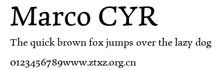 Marco CYR.ttf是由字体厂商(设计师)方正出品的一款字体.方正字库隶属于北京北大方正电子有限公司(简称方正电子)。方正电子是专业从事中文字库开发的厂商,现拥有各种中、西文以及多民族文种字库数百款。作为享誉全球的方正中文电子出版系统的重要组成部分,方正字库一向以字款丰富,品质精良,适用面广,能迅速满足客户需求而在专业出版、印刷领域中享有盛誉。方正电子一向以推动中文字库技术进步,促进中文印刷字体的发展为己任,每年推出的创新字体都在十款以上。同时,方正电子还积极参与中国国家标准和国际ISO组织相关标准的制订,如GBK、GB18030、ISO/IEC-10646等。方正字库字款丰富、字形美观、性能稳定、适应面广,运行速度快,且存贮容量小。全面支持GB、GBK、GB18030、BIG-5以及JIS、KSC等编码体系,可以提供TrueType,PostScript Type1、Type0、CID等各种通用格式字库。方正字库官网http://www.foundertype.com/index.php/FindFont/index.html?utm_source=zitixiazai