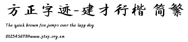 方正字迹-建才行楷 简繁.TTF是由字体厂商(设计师)方正出品的一款字体.方正字库隶属于北京北大方正电子有限公司(简称方正电子)。方正电子是专业从事中文字库开发的厂商,现拥有各种中、西文以及多民族文种字库数百款。作为享誉全球的方正中文电子出版系统的重要组成部分,方正字库一向以字款丰富,品质精良,适用面广,能迅速满足客户需求而在专业出版、印刷领域中享有盛誉。方正电子一向以推动中文字库技术进步,促进中文印刷字体的发展为己任,每年推出的创新字体都在十款以上。同时,方正电子还积极参与中国国家标准和国际ISO组织相关标准的制订,如GBK、GB18030、ISO/IEC-10646等。方正字库字款丰富、字形美观、性能稳定、适应面广,运行速度快,且存贮容量小。全面支持GB、GBK、GB18030、BIG-5以及JIS、KSC等编码体系,可以提供TrueType,PostScript Type1、Type0、CID等各种通用格式字库。方正字库官网http://www.foundertype.com/index.php/FindFont/index.html?utm_source=zitixiazai