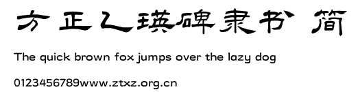 方正乙瑛碑隶书 简.TTF是由字体厂商(设计师)方正出品的一款字体.方正字库隶属于北京北大方正电子有限公司(简称方正电子)。方正电子是专业从事中文字库开发的厂商,现拥有各种中、西文以及多民族文种字库数百款。作为享誉全球的方正中文电子出版系统的重要组成部分,方正字库一向以字款丰富,品质精良,适用面广,能迅速满足客户需求而在专业出版、印刷领域中享有盛誉。方正电子一向以推动中文字库技术进步,促进中文印刷字体的发展为己任,每年推出的创新字体都在十款以上。同时,方正电子还积极参与中国国家标准和国际ISO组织相关标准的制订,如GBK、GB18030、ISO/IEC-10646等。方正字库字款丰富、字形美观、性能稳定、适应面广,运行速度快,且存贮容量小。全面支持GB、GBK、GB18030、BIG-5以及JIS、KSC等编码体系,可以提供TrueType,PostScript Type1、Type0、CID等各种通用格式字库。方正字库官网http://www.foundertype.com/index.php/FindFont/index.html?utm_source=zitixiazai